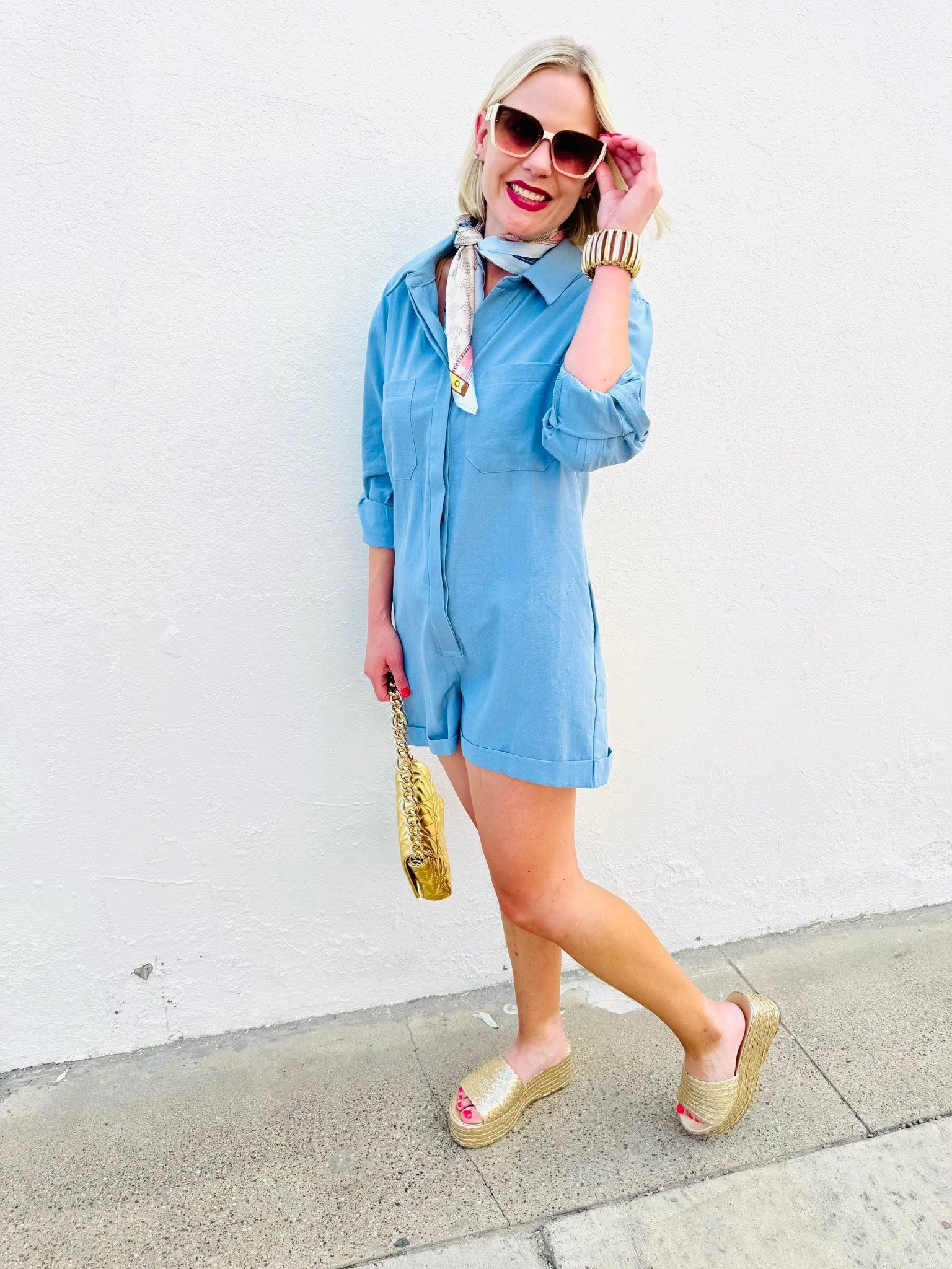 It doesn't get trendier than this unique romper! - Unlined denim with subtle faded detail - A collared neckline - A button down bodice - 3/4 sleeves with cuffs - Functional high front pockets as well as back pockets - A relaxed yet flattering silhouette that ends in upper-thigh length rolled hemline