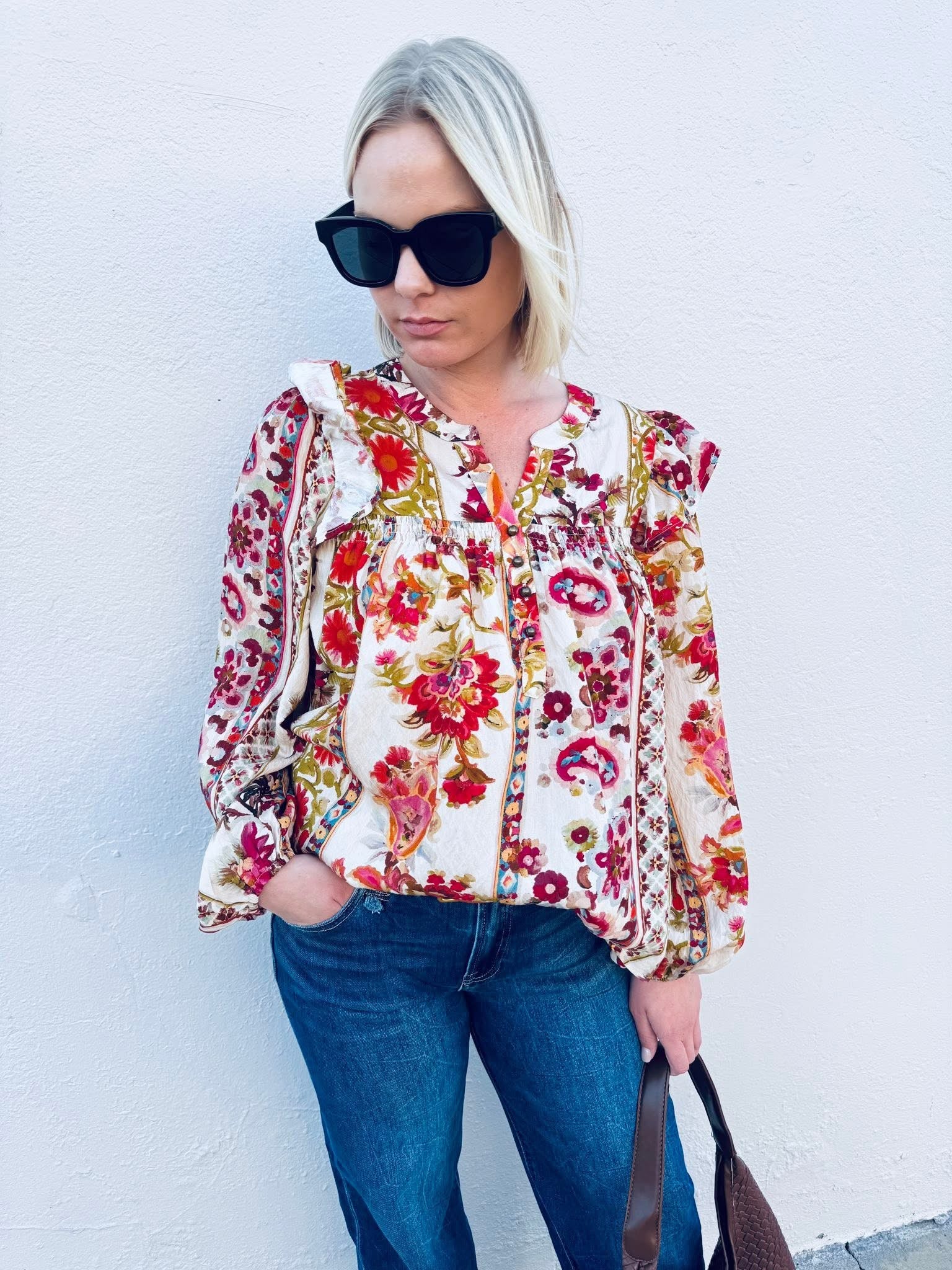 This sweet top is full of fall feels! With a cute floral print featuring all the colors of a breezy Autumn day and a chic neckline, it is sure to keep you feeling fabulous. - Unlined lightweight material with an abstract floral print featuring magenta, red, green, and different orange hues - A v-neckline with four button closure - Long, loose sleeves with elastic cuffs - A relaxed silhouette that ends in a straight hemline