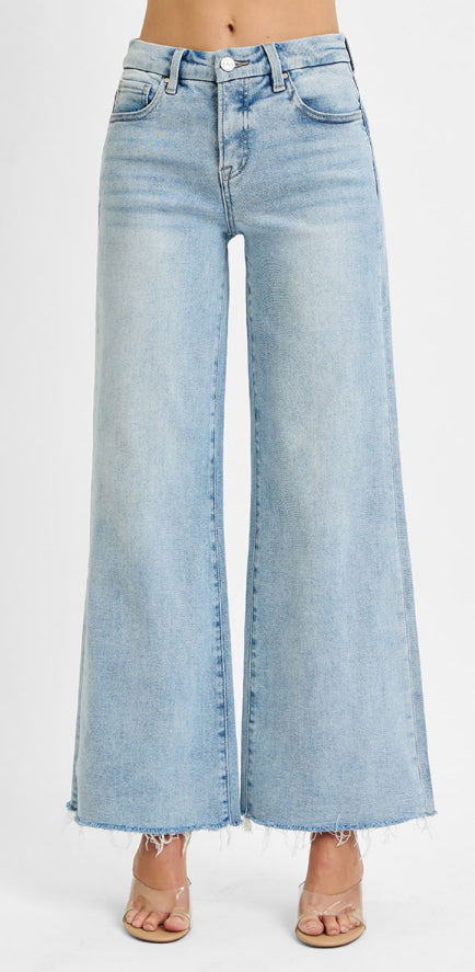 Elevate your denim game with these playful light wash wide leg jeans! The classic mid-rise silhouette features tummy control for a flattering fit, while the non-distressed design keeps things timeless. The fun fray hem adds just the right amount of personality to your outfit. Perfect for mixing and matching with your favorite tops!
