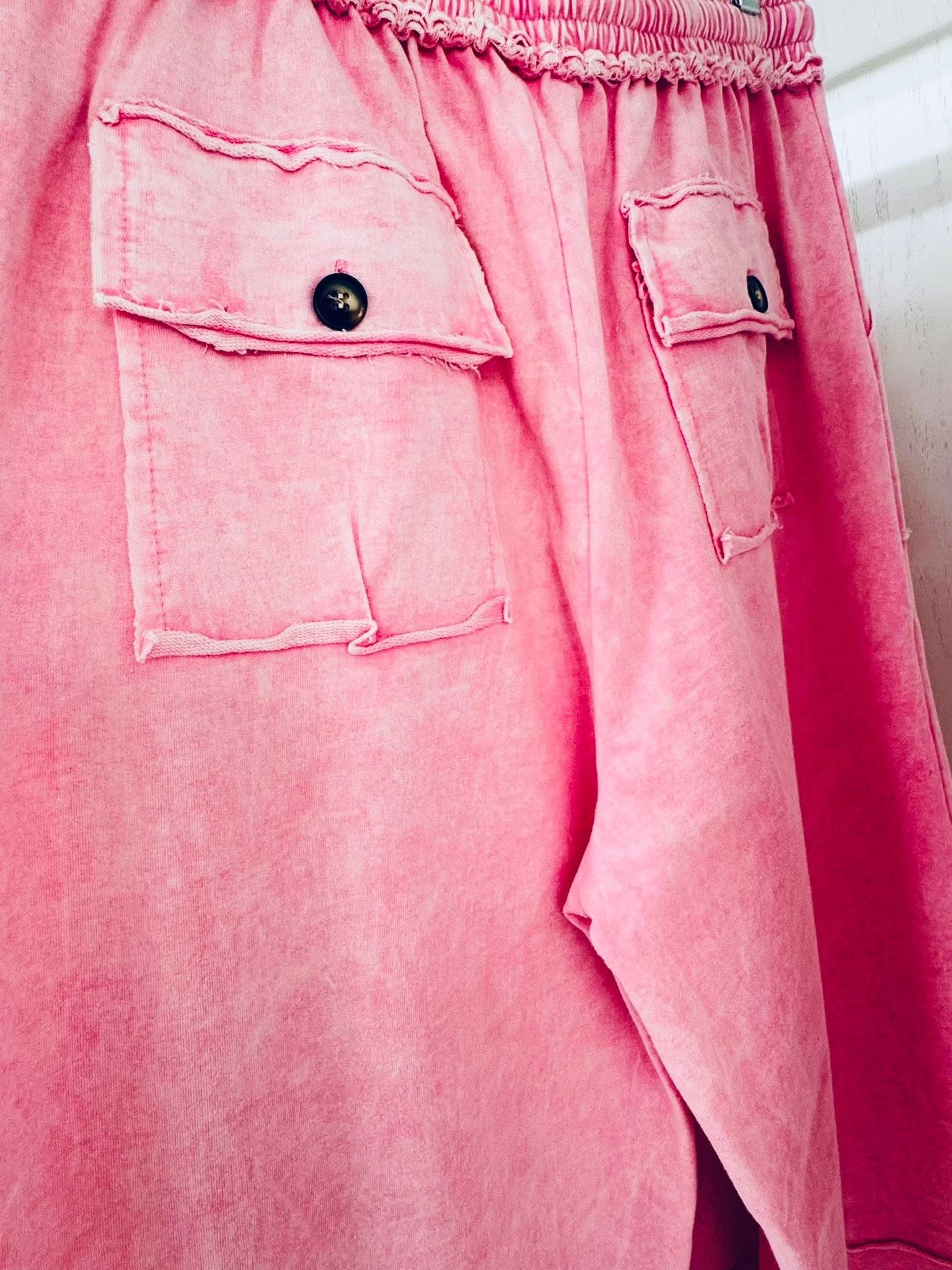 Elevate your style with these Mineral Washed Terry Knit Pants in pink. These pants provide ultimate comfort and versatility. Perfect for lounging or a casual day look with a fitted top and cute sneakers. Get ready to never want to take them off!