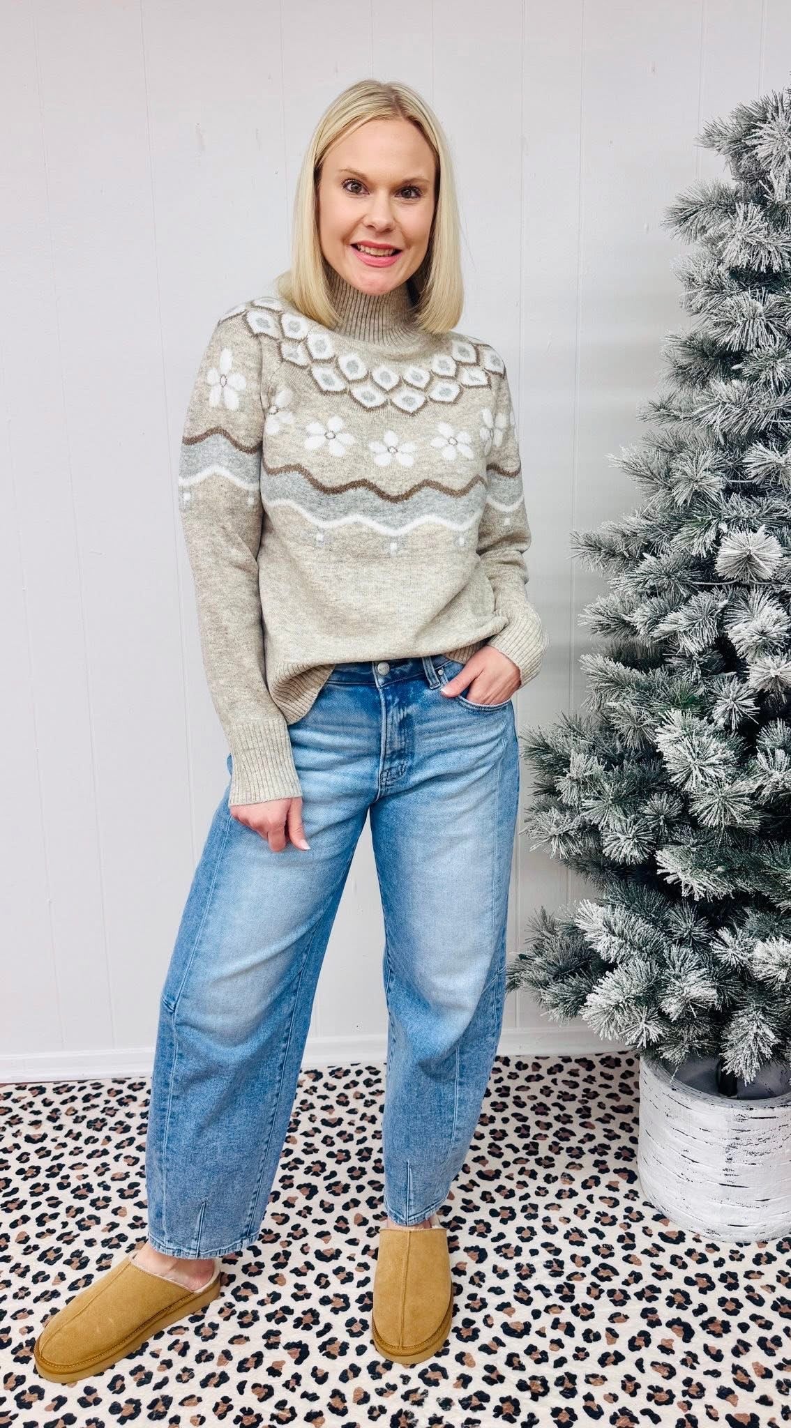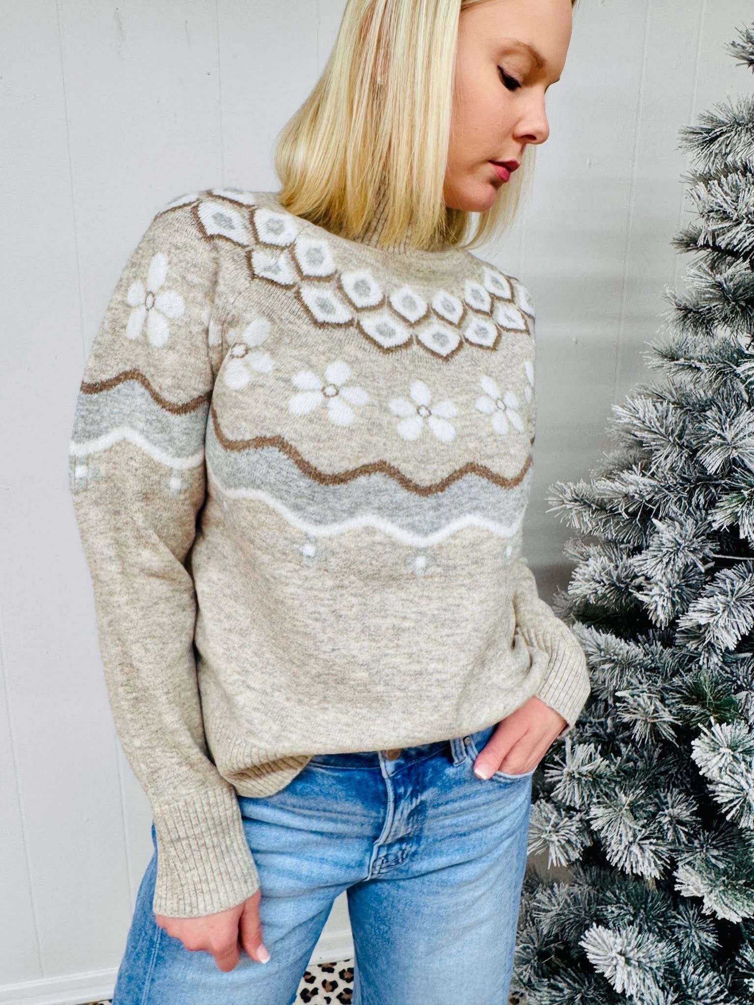 Embrace effortless comfort with The Nordic Pattern Sweater, featuring a timeless Nordic pattern that adds character to your everyday wardrobe. The relaxed drop shoulder silhouette creates a laid-back, modern fit that flatters all body types, while the mock neckline offers a classic, approachable look. Crafted from soft, cozy materials, this sweater becomes your go-to piece for staying warm and feeling great throughout the season. Perfect for casual days or layering, it's the kind of sweater you'll reach for again and again.