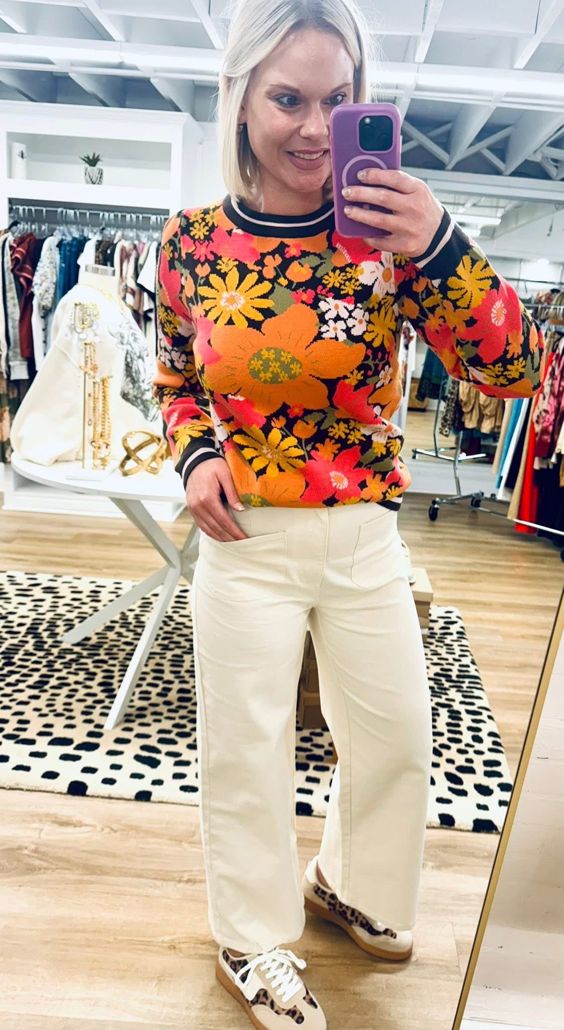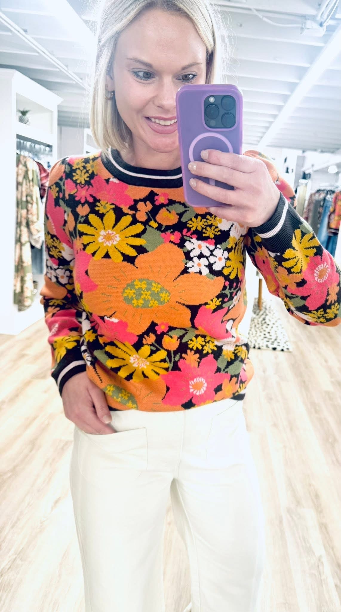 The Making An Entrance Floral Sweater features a round neckline and long sleeves with charming brown and pale pink contrast trim. Crafted from premium knit, it’s a cozy, stylish way to brighten your wardrobe.